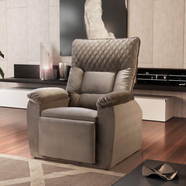 Encosto e braços em flocos de espuma e camada de fibra de poliéster siliconada.