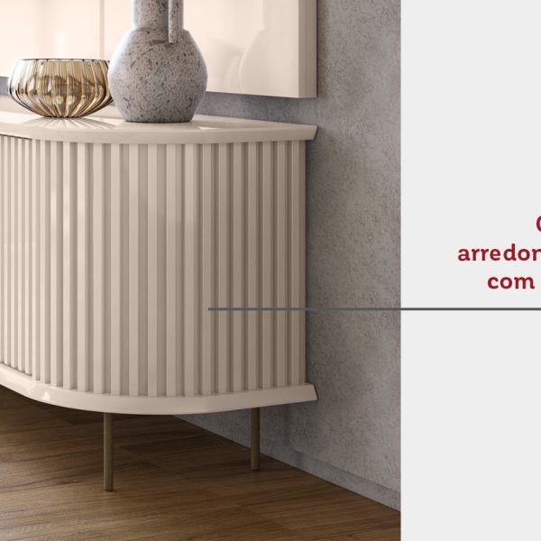 A bancada conta com laterais curvas ripadas decorativas, tampo e base usinados com cantos curvos acompanhando as laterais e com bordas chanfradas, trazendo as mais atuais tendências de design.