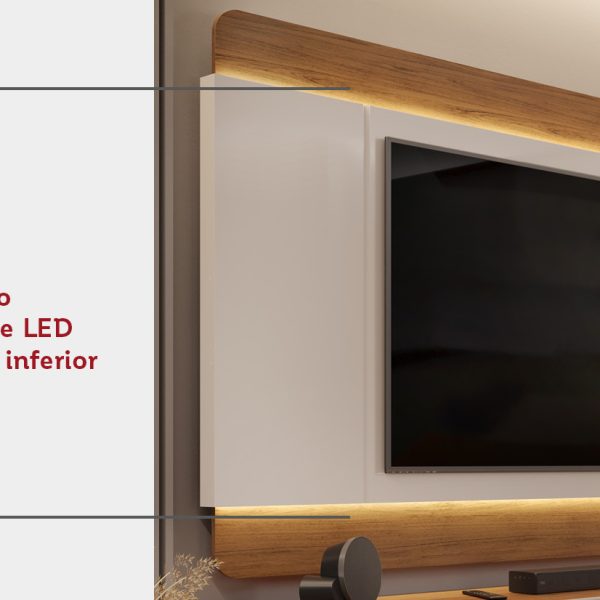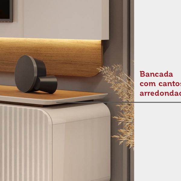 A Bancada conta com um tampo chanfrado e de cantos arredondados, mantendo a geometria mais arredondada em conjunto com a caixaria e suas duas portas de giro também arredondadas e com acabamento 3D form, trazendo uma sofisticação a mais ao produto. Para dispor seus aparelhos eletrônicos conte com os dois nichos centrais na bancada. Não se preocupe com os cabos, este produto possui passa-fios para facilitar a organização dos cabos por trás do produto. Para facilitar a limpeza, a bancada é estruturada com pés metálicos que a afastam do chão, aumentando sua durabilidade.