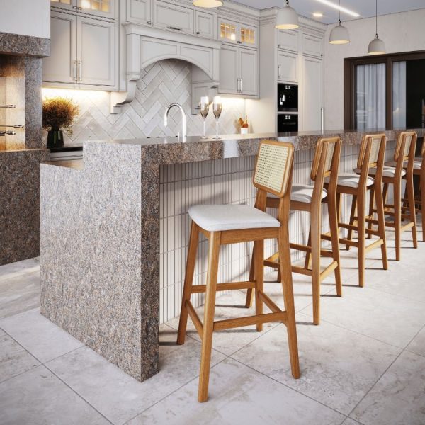 Estrutura e encosto anatômico (curvo) em madeira maciça, com aplicação em tela de fibra natural.