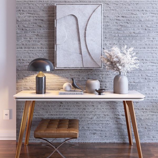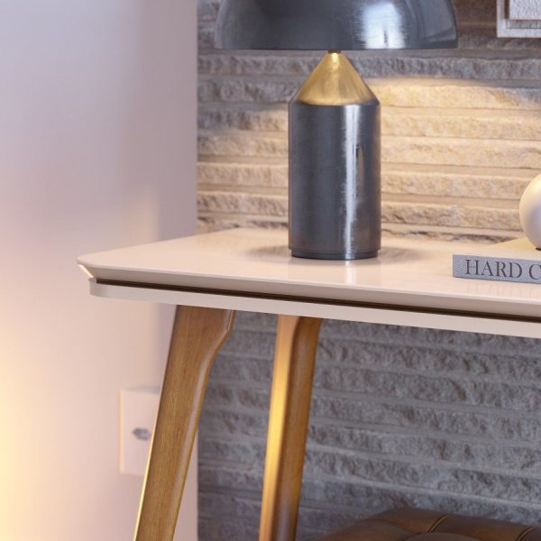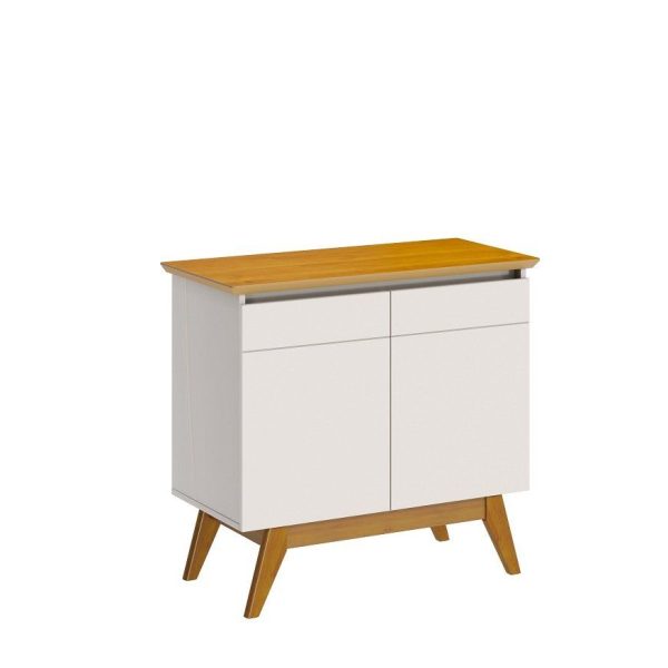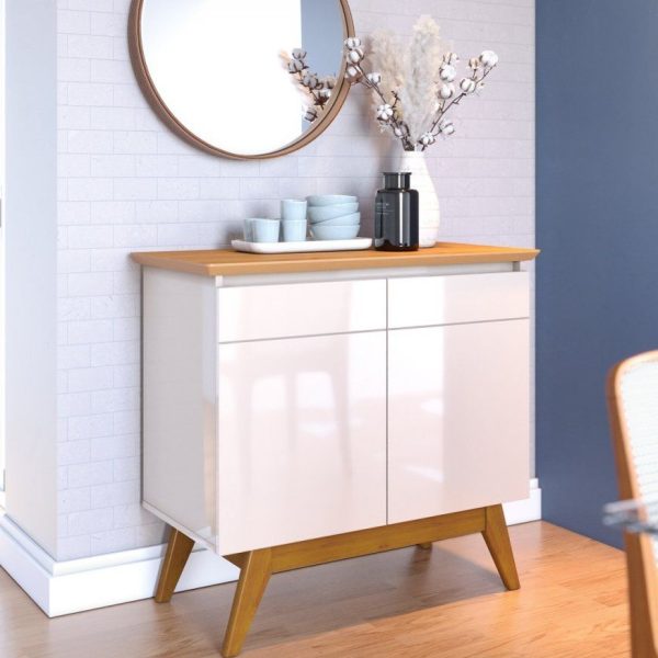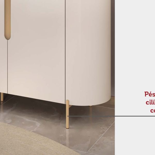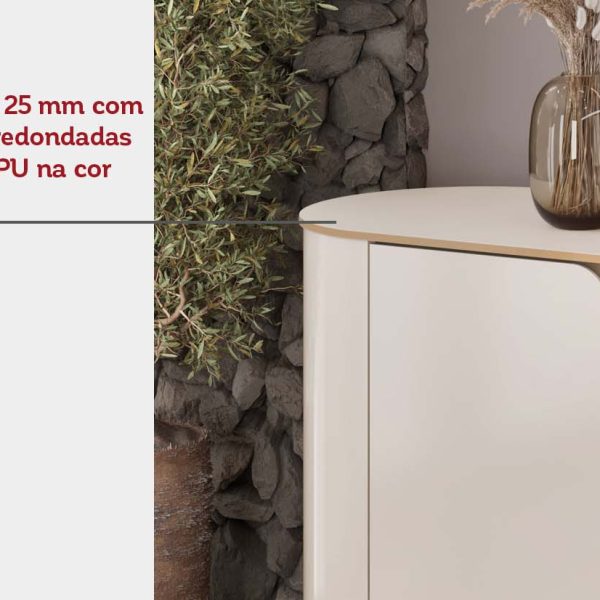 Possui um design moderno e sofisticado, fazendo uso de cantos arredondados para trazer mais leveza e sofisticação para seu ambiente. Seu tampo é de 25mm usinado com cantos arredondados, adornado por uma pintura PU na cor dourada em suas bordas. Com quatro portas de giro em MDF com detalhe usinado, além de duas prateleiras internas você terá espaço para guardar seus objetos e utilidades domésticas organizadamente, é um móvel prático e funcional.
