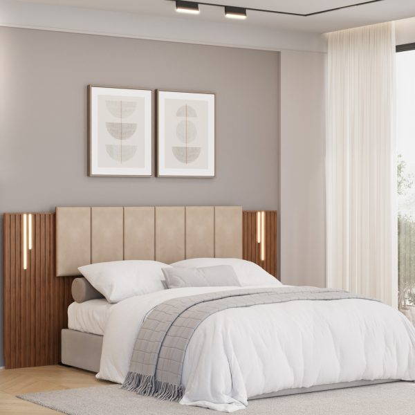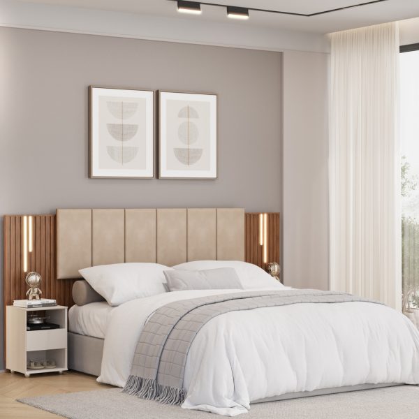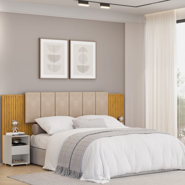 É uma peça charmosa e funcional, sendo extensível e comportando tanto colchões no tamanho Casal de 1,38m, Queen de 1,58m e também tamanho King de 1,93m. Toda sua extensão é composta de painéis ripados de MDF com recobrimento decorativo, tornando-a uma peça totalmente alinhada com as mais recentes tendências de decoração.