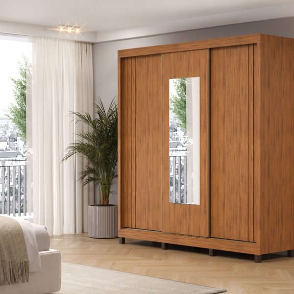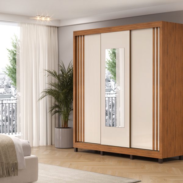 O Guarda-Roupa Delta é um produto que foi desenvolvido utilizando painéis 100% MDF para melhor acabamento e atender os consumidores mais exigentes. É um produto espaçoso projetado para armazenar de forma funcional e prática, para isso possui 3 portas de correr com detalhe de ripas que traz um design original ao produto.