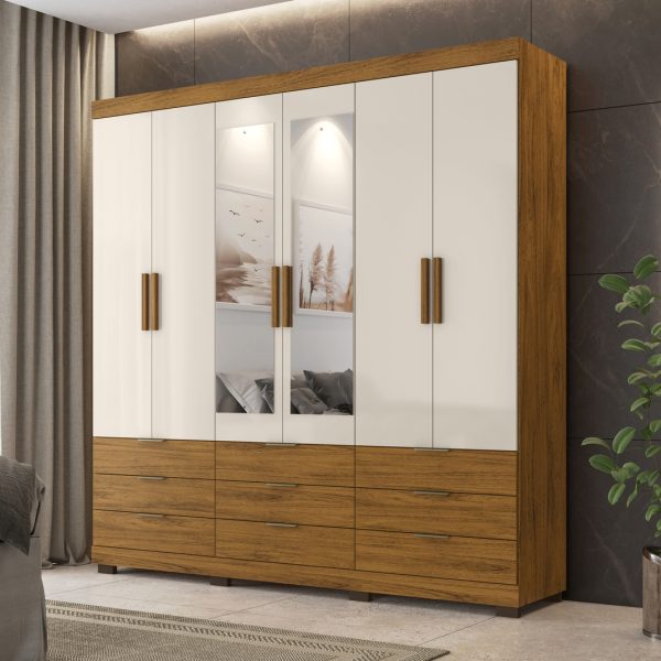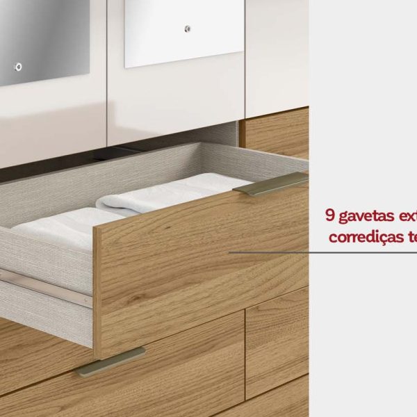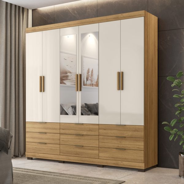 O Guarda-Roupas Dublin é um produto espaçoso pensado para o armazenamento de uma maneira funcional e prática, para isto ele conta com 6 portas de giro com dobradiças metálicas, sendo que as portas centrais comportam amplos espelhos, além de também conter 9 gavetas externas com corrediças telescópicas.Para dar um toque especial, as portas possuem puxadores de MDF revestido e as gavetas contam com puxadores de topo com acabamento na cor bronze, o que dá todo requinte para seu ambiente.