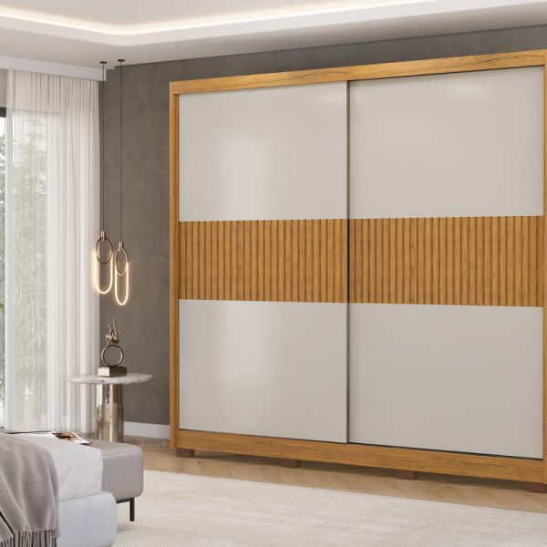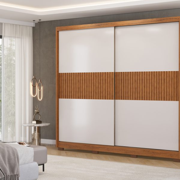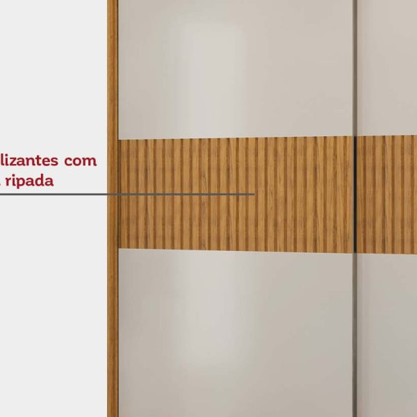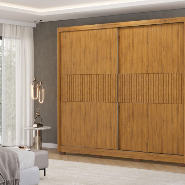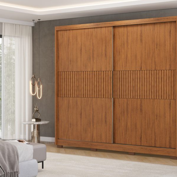 O Guarda-Roupa Flórida é um produto espaçoso pensado para o armazenamento de uma maneira funcional e prática, para isto ele conta com 2 portas deslizantes com faixa central ripada que traz um design original para o produto. Sua divisão interna foi desenhada com muito cuidado, sendo feita uma pesquisa para atender todas às necessidades dessa linha, conta com 4 gavetas com corrediças telescópicas, maleiro espaçoso para uma melhor organização, 9 prateleiras sendo 4 móveis