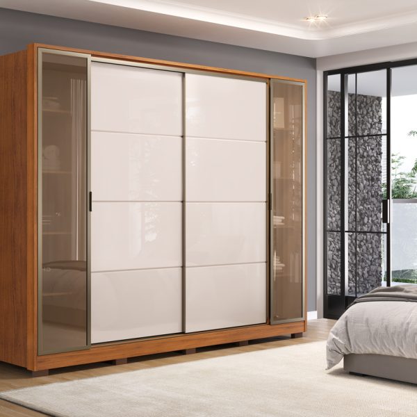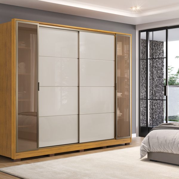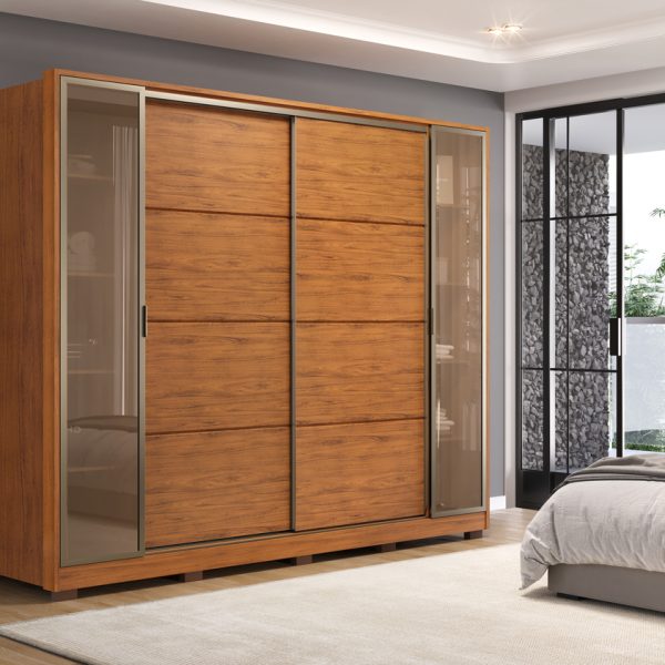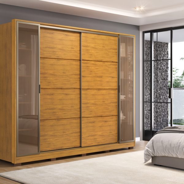 Visando proporcionar um acabamento superior e satisfazer as necessidades dos consumidores mais exigentes, este produto amplo foi projetado para oferecer armazenamento de forma prática e funcional, apresentando 4 portas, sendo 2 de bater e 2 deslizantes, com puxadores revestidos em MDF e acabamento em bronze, juntamente com puxadores equipados com dobradiças metálicas com amortecimento, que aumentam a resistência das portas.