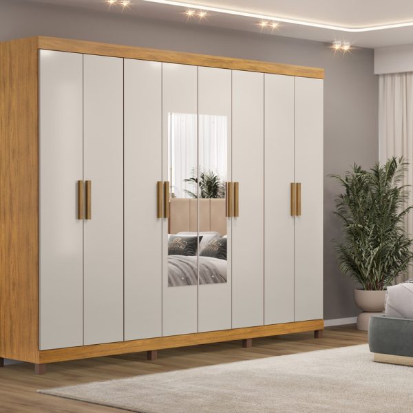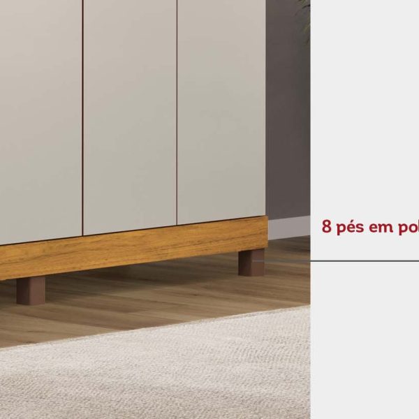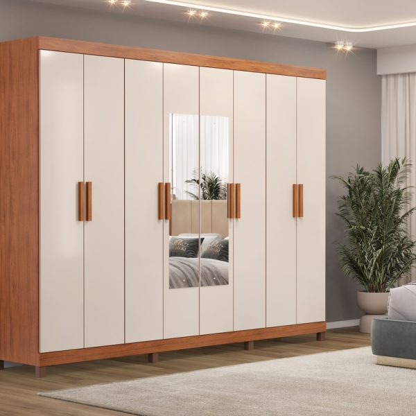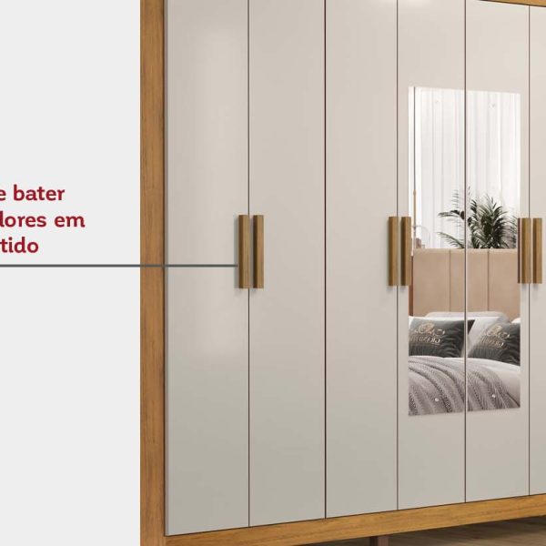 O Guarda-Roupa Pulse é um produto espaçoso pensado para o armazenamento de uma maneira funcional e prática, para isto ele conta com 8 portas com um detalhe chanfrado que traz um design original para o produto além dos puxadores em MDF com pega ergonômica e revestidos na cor amadeirada do produto e as dobradiças metálicas que proporcionam maior resistência para as portas.