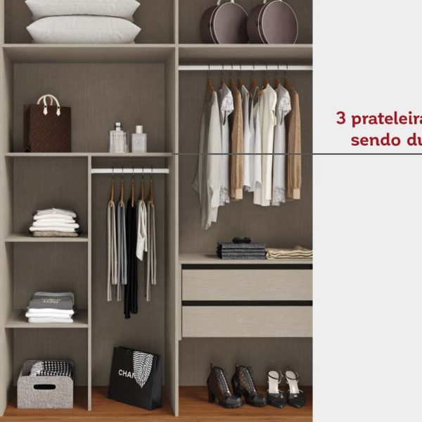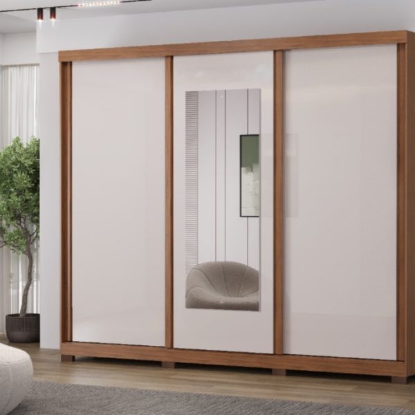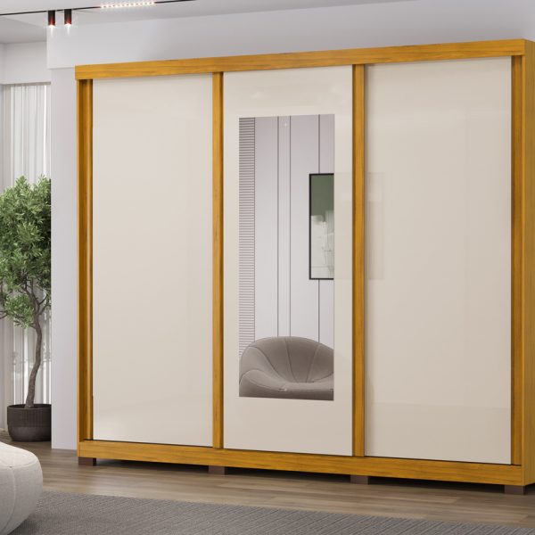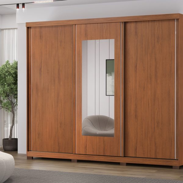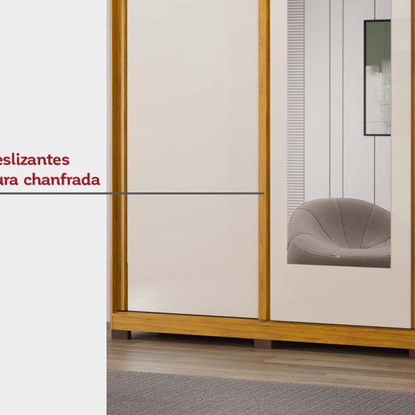para ter melhor acabamento, resistência e atender aos consumidores mais exigentes. Ele é um produto espaçoso pensado para o armazenamento de uma maneira funcional e prática, para isto ele conta com 3 portas deslizantes com um detalhe chanfrado que traz um design original para o produto além da pega ergonômica na cor amadeirada do produto.