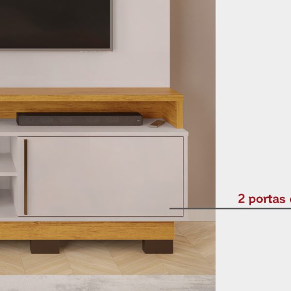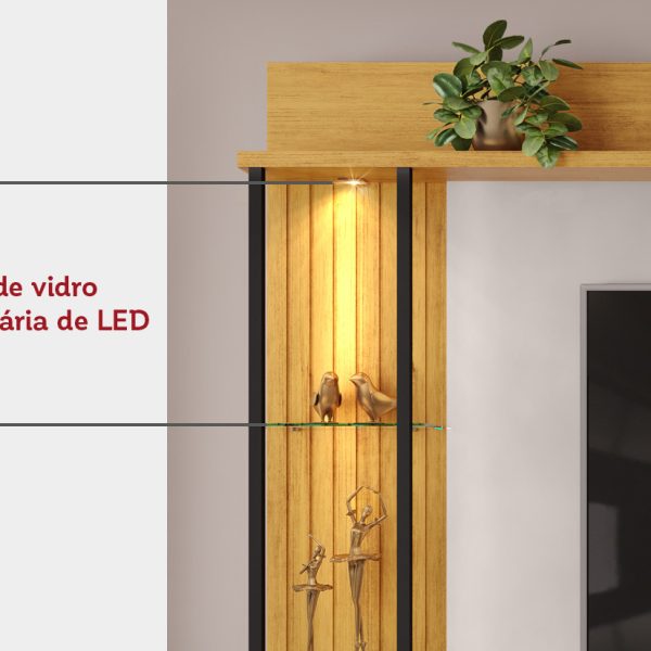 Aproveite a prateleira superior e as prateleiras de vidro para expor seus objetos de decoração, que serão ainda mais destacados pela luminária de LED na prateleira superior. Para seus eletrônicos, existem espaços abaixo do tampo e também uma prateleira inferior, que se encontra entre as duas portas deslizantes. Aliás, as portas deslizantes possibilitam aquele espaço mais escondido onde você pode guardar seus objetos de forma prática e organizada.