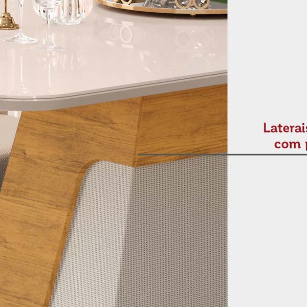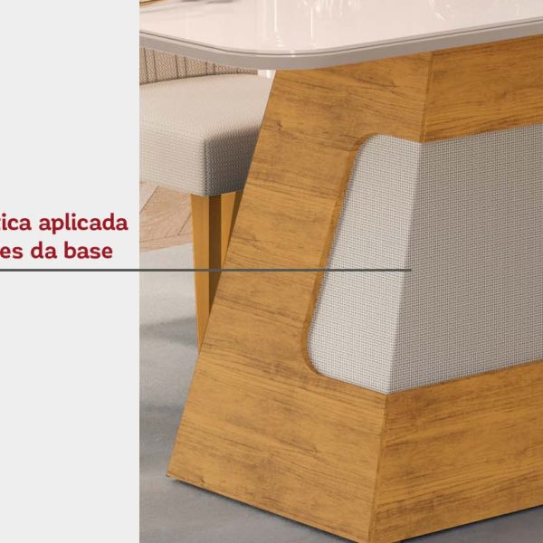 A Mesa Dala é o que você precisa para decorar a sua sala de jantar, ela possui um design moderno em formato trapézio, com recortes decorativos usinados, tornando-a muito elegante e moderna. Dentro destes recortes são aplicadas telas sintéticas, que seguem as mais atuais tendências de decoração. O tampo possui vidro pintado aplicado na madeira, aumentando a durabilidade do produto e tornando a limpeza mais fácil e prática. Esta mesa é produzida em MDF e MDP, que são chapas de madeira reconstituída advindas de reflorestamento, matéria prima que não prejudica o ambiente e garante durabilidade e resistência ao seu produto.