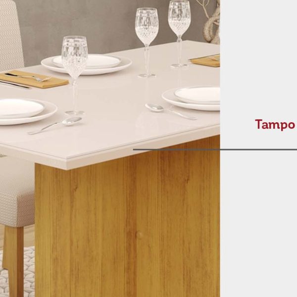 O tampo chanfrado com vidro, segue as tendências de decorações mais atuais, tornando a mesa muito sofisticada. A Mesa Hera possui espaço para 4 pessoas, você poderá acomodar amigos e familiares confortavelmente. Com a base em formato ‘cruz’, você também terá espaço para acomodar todas as cadeiras, deixando o seu ambiente mais espaçoso e organizado. O sistema estrutural dela é muito resistente, composta por peças de 25mm de espessura, derivados de madeira de reflorestamento, que são resistentes e ecologicamente corretos.