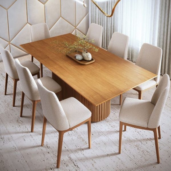 Base revestida em lâmina de madeira cinamomo, com ripas em madeira maciça.