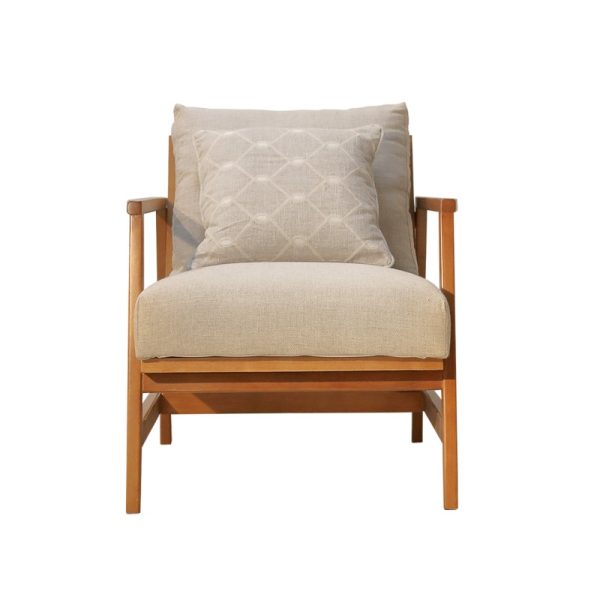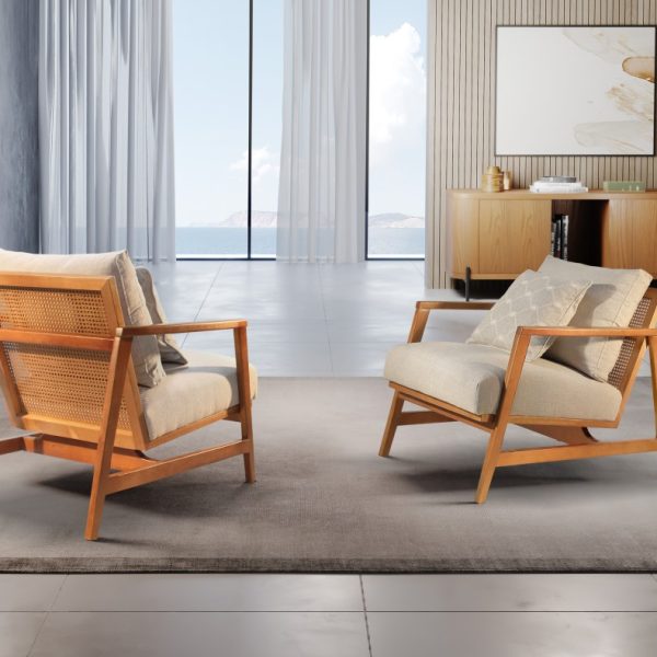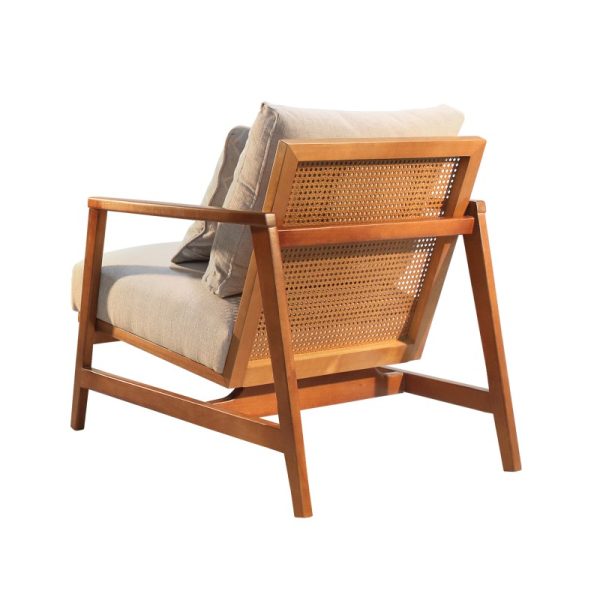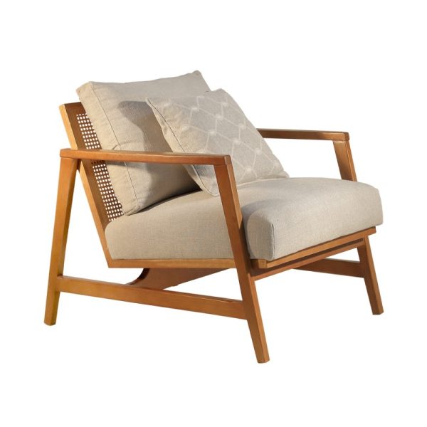 Encosto com almofada solta em fibra de poliéster siliconada e acabamento em rattan.