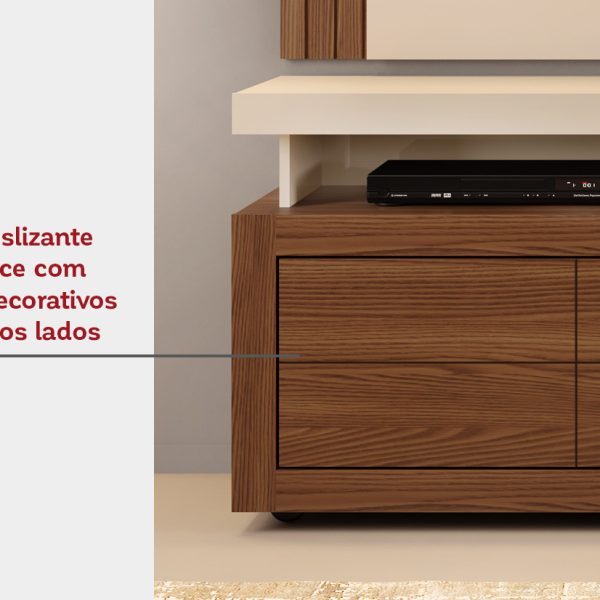 É um produto prático, moderno e que se adapta a qualquer ambiente. O rack contém um design elegante, e possui espaços para aparelhos eletrônicos como DVD, TV à cabo e objetos decorativos. O tampo suporta até 40kg e é ideal para TVs de até 55 polegadas.