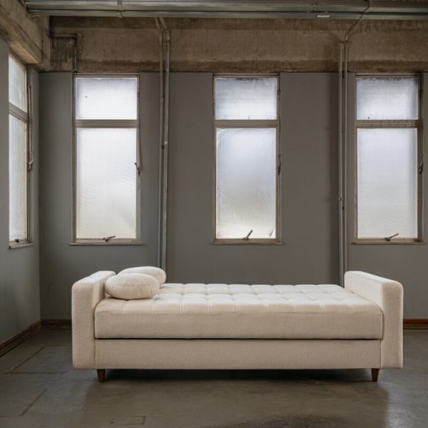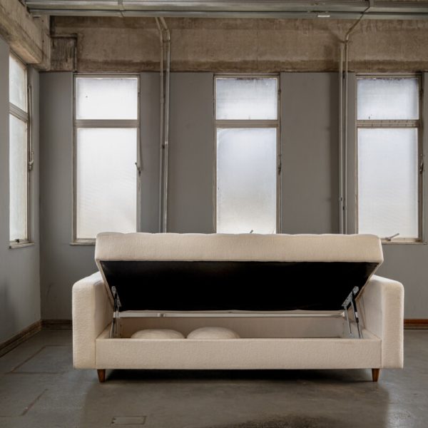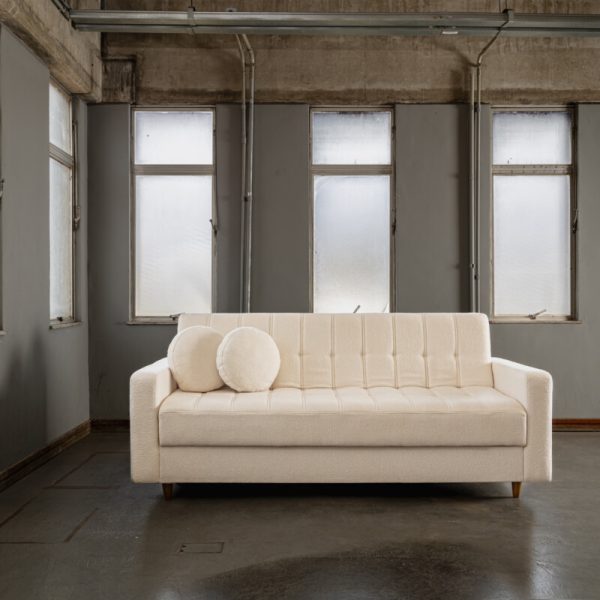Assento e encosto em espuma D33, com camada de espuma HR (alta resiliência), molas espirais e percintas elásticas.