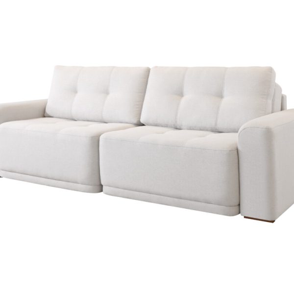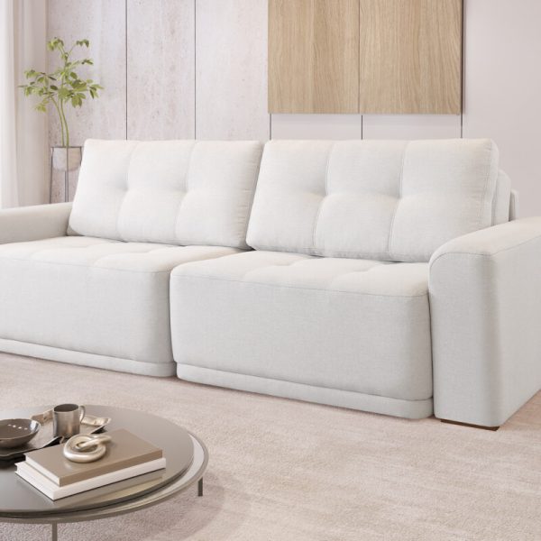 Assento e encosto em espuma D33, com camada de espuma HR (alta resiliência), fibra de poliéster siliconada e molas espirais, encosto reclinável com catraca de estágio.
