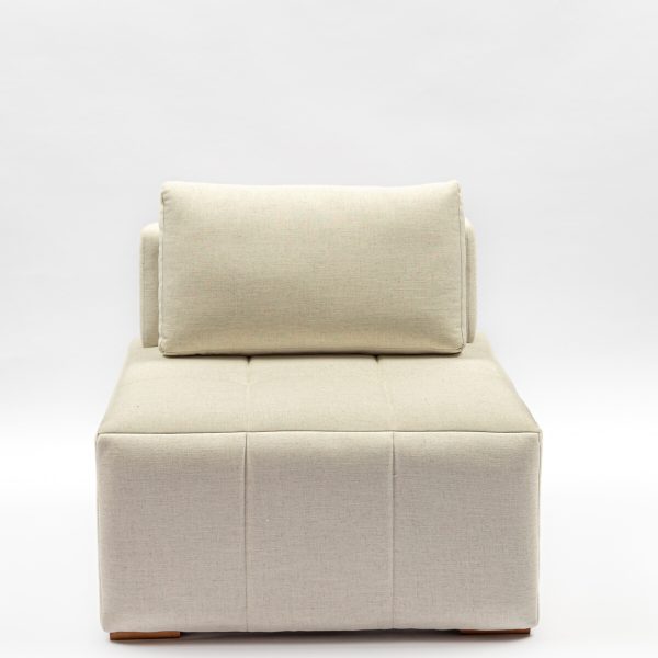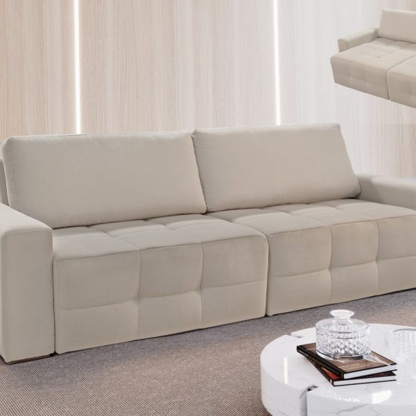 Assento retrátil em espuma D33, com camada de espuma HR (alta resiliência), fibra de poliéster siliconada, molas espirais na base e percintas elásticas.