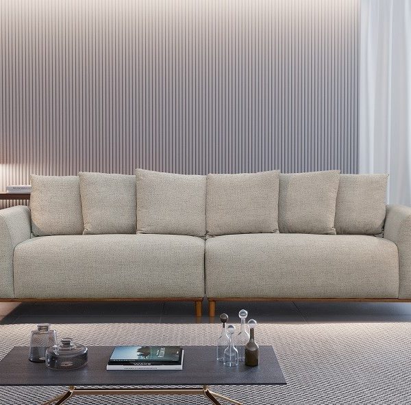 Encosto com almofadas soltas em fibra de poliéster siliconada.