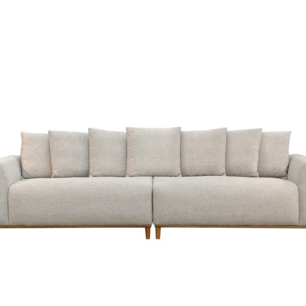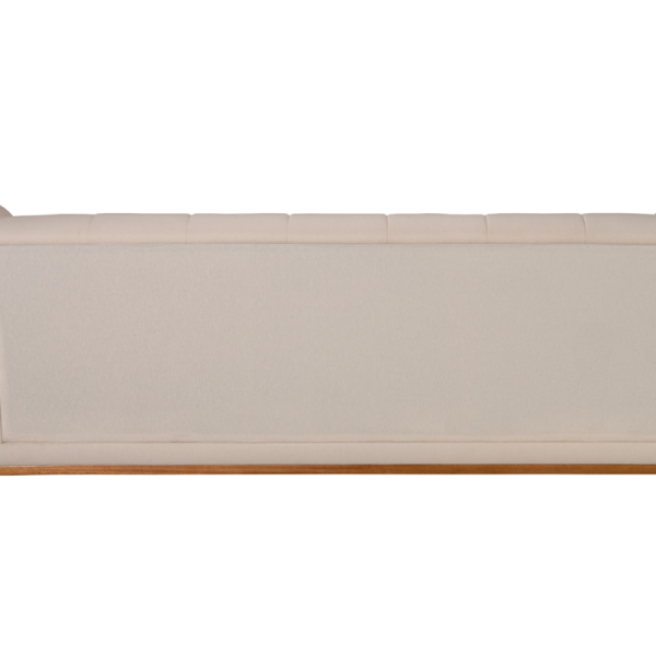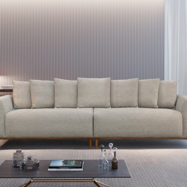Encosto com almofadas soltas em fibra de poliéster siliconada.
